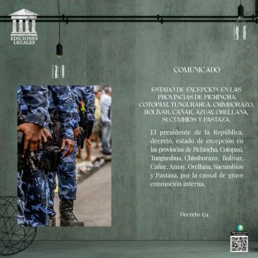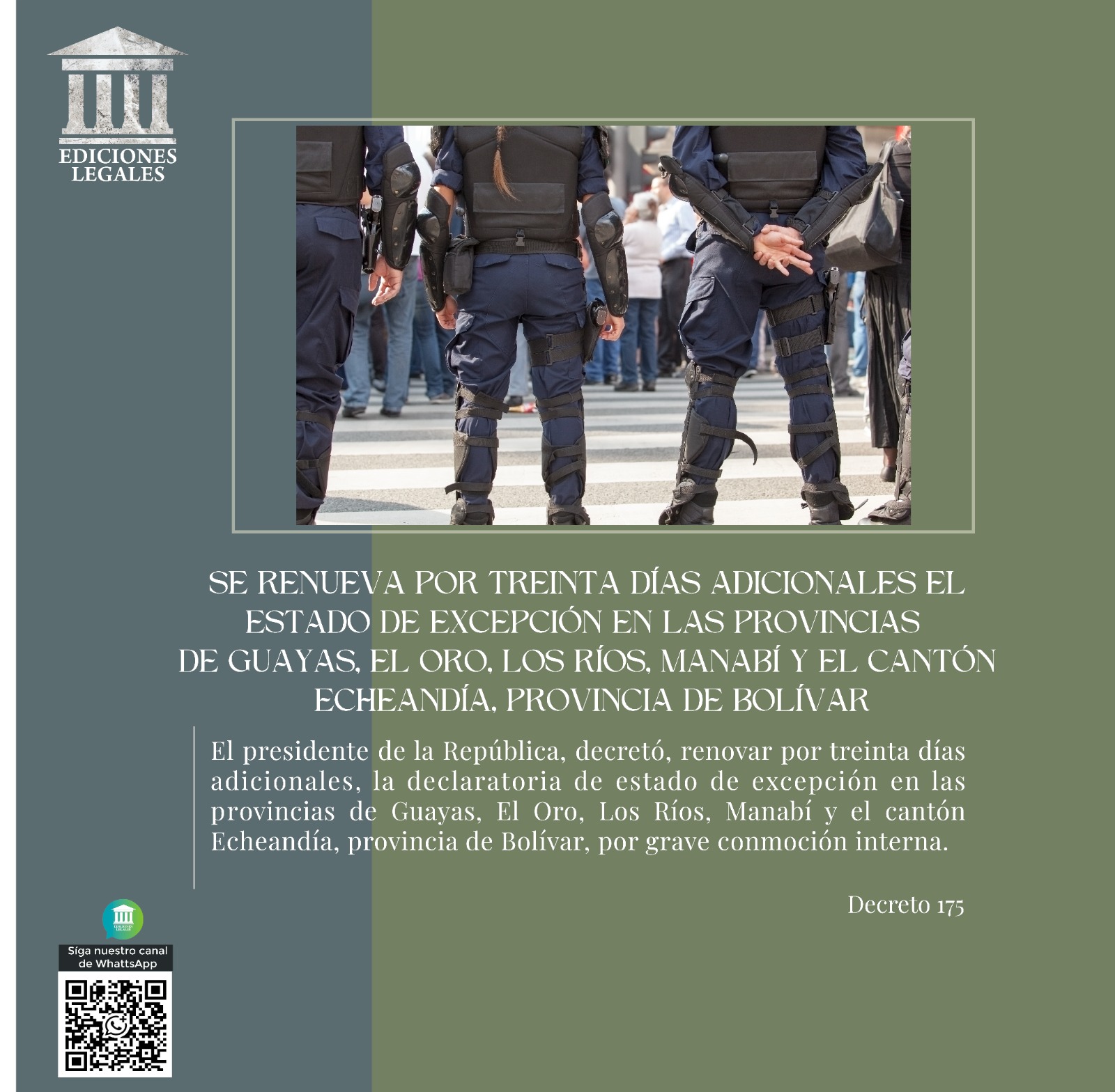 El presidente de la República, decretó, renovar por treinta días adicionales, la declaratoria de estado de excepción en las provincias de Guayas, El Oro, Los Ríos, Manabí y el cantón Echeandía, provincia de Bolívar, por grave conmoción interna en los términos establecidos en los Decretos Ejecutivos No. 76 y 109 de 06 y 20 de agosto de 2025.