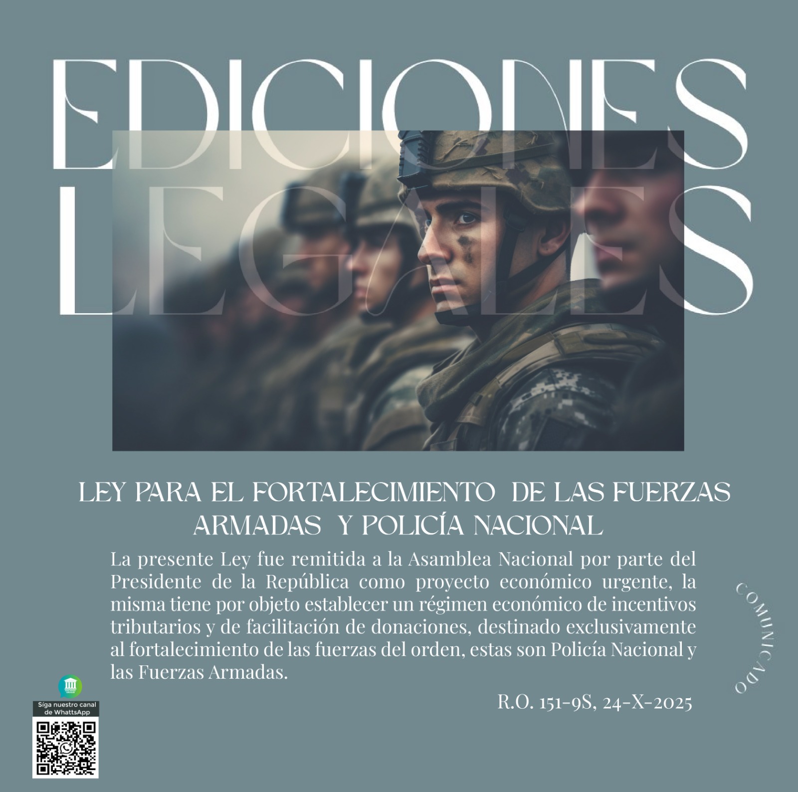 La presente Ley fue remitida a la Asamblea Nacional por parte del Presidente de la República como proyecto económico urgente, la misma que tiene por objeto establecer un régimen económico de incentivos tributarios y de facilitación de donaciones, destinado exclusivamente al fortalecimiento de las fuerzas del orden, estas son Policía Nacional y las Fuerzas Armadas, para el cumplimiento de sus atribuciones constitucionales, en el ejercicio de las actividades de protección interna, mantenimiento del orden público, seguridad ciudadana, defensa nacional y seguridad integral del Estado, como medida de política fiscal y económica para la protección del aparato productivo nacional y la estabilidad de las finanzas públicas.