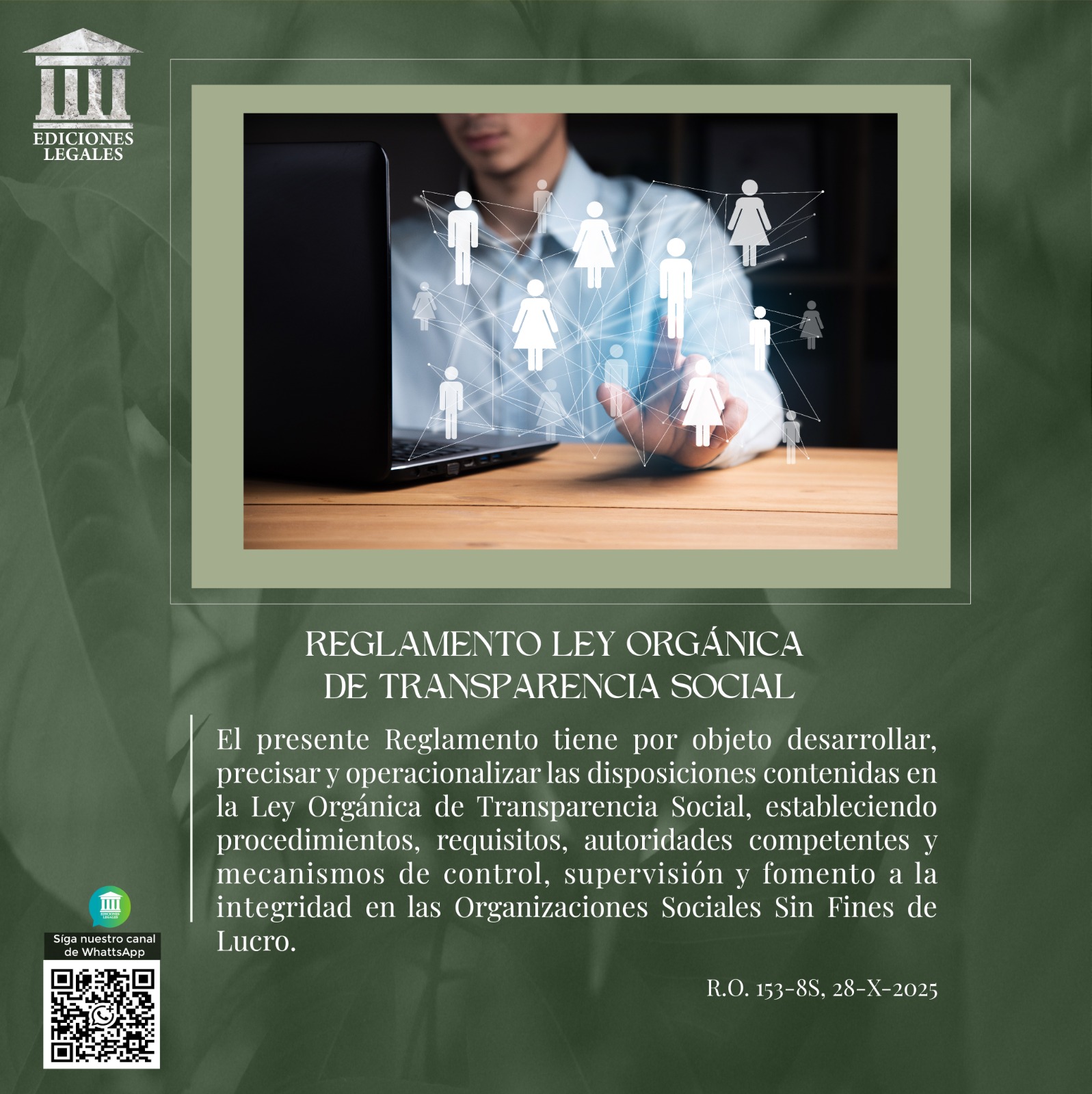 El presente Reglamento tiene por objeto desarrollar, precisar y operacionalizar las disposiciones contenidas en la Ley Orgánica de Transparencia Social, estableciendo procedimientos, requisitos, autoridades competentes y mecanismos de control, supervisión y fomento a la integridad en las Organizaciones Sociales Sin Fines de Lucro (OSSFL); así como su constitución, reconocimiento de personalidad jurídica, funcionamiento, procesos de constitución, fusión, escisión, transformación y disolución.