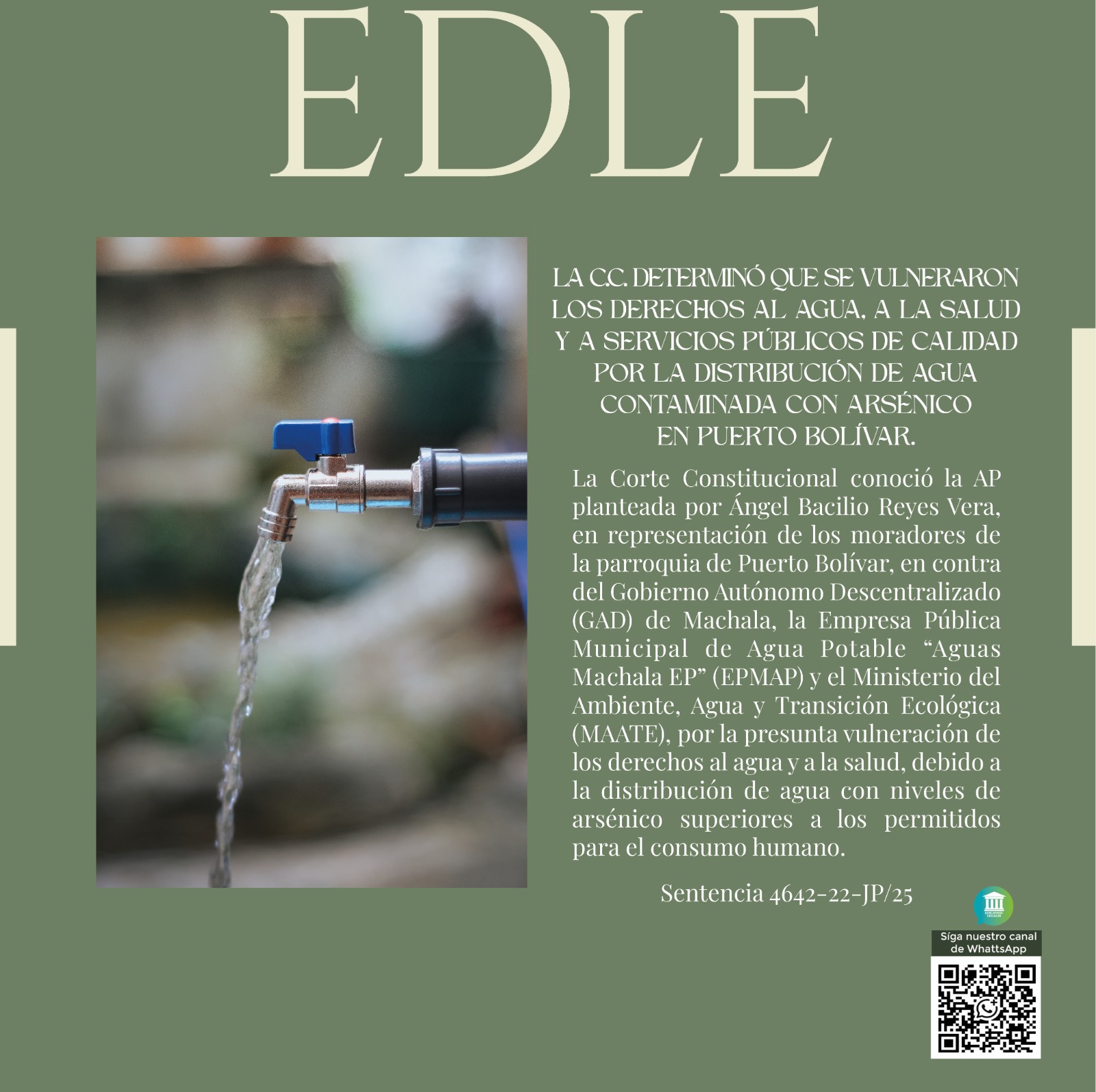 La Corte Constitucional conoció la AP planteada por Ángel Bacilio Reyes Vera, en representación de los moradores de la parroquia de Puerto Bolívar, en contra del Gobierno Autónomo Descentralizado (GAD) de Machala, la Empresa Pública Municipal de Agua Potable “Aguas Machala EP” (EPMAP) y el Ministerio del Ambiente, Agua y Transición Ecológica (MAATE), por la presunta vulneración de los derechos al agua y a la salud, debido a la distribución de agua con niveles de arsénico superiores a los permitidos para el consumo humano.