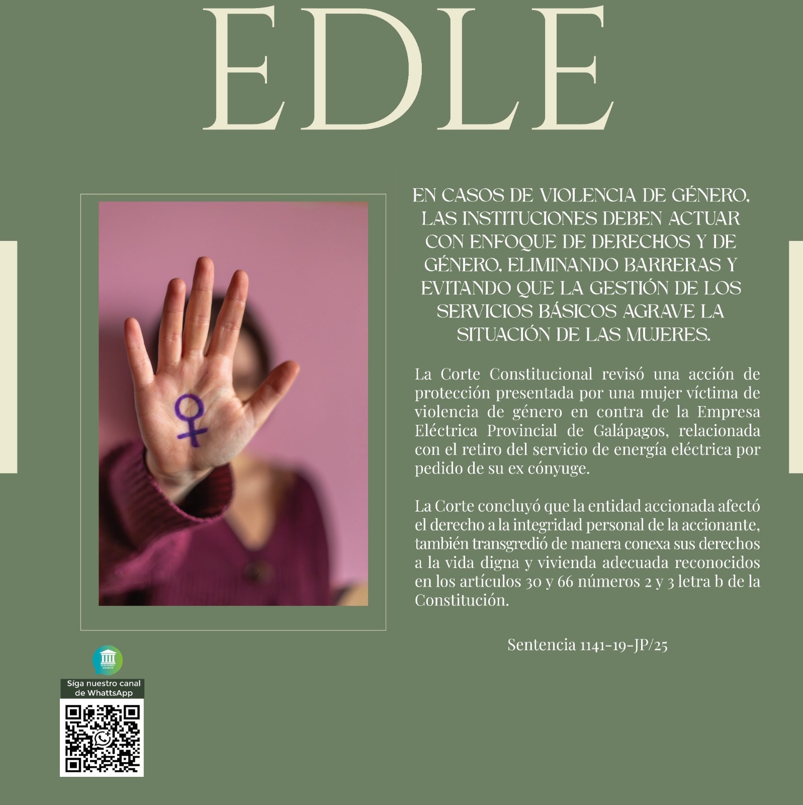 La Corte Constitucional revisó una acción de protección presentada por una mujer víctima de violencia de género en contra de la Empresa Eléctrica Provincial de Galápagos, relacionada con el retiro del servicio de energía eléctrica por pedido de su ex cónyuge.