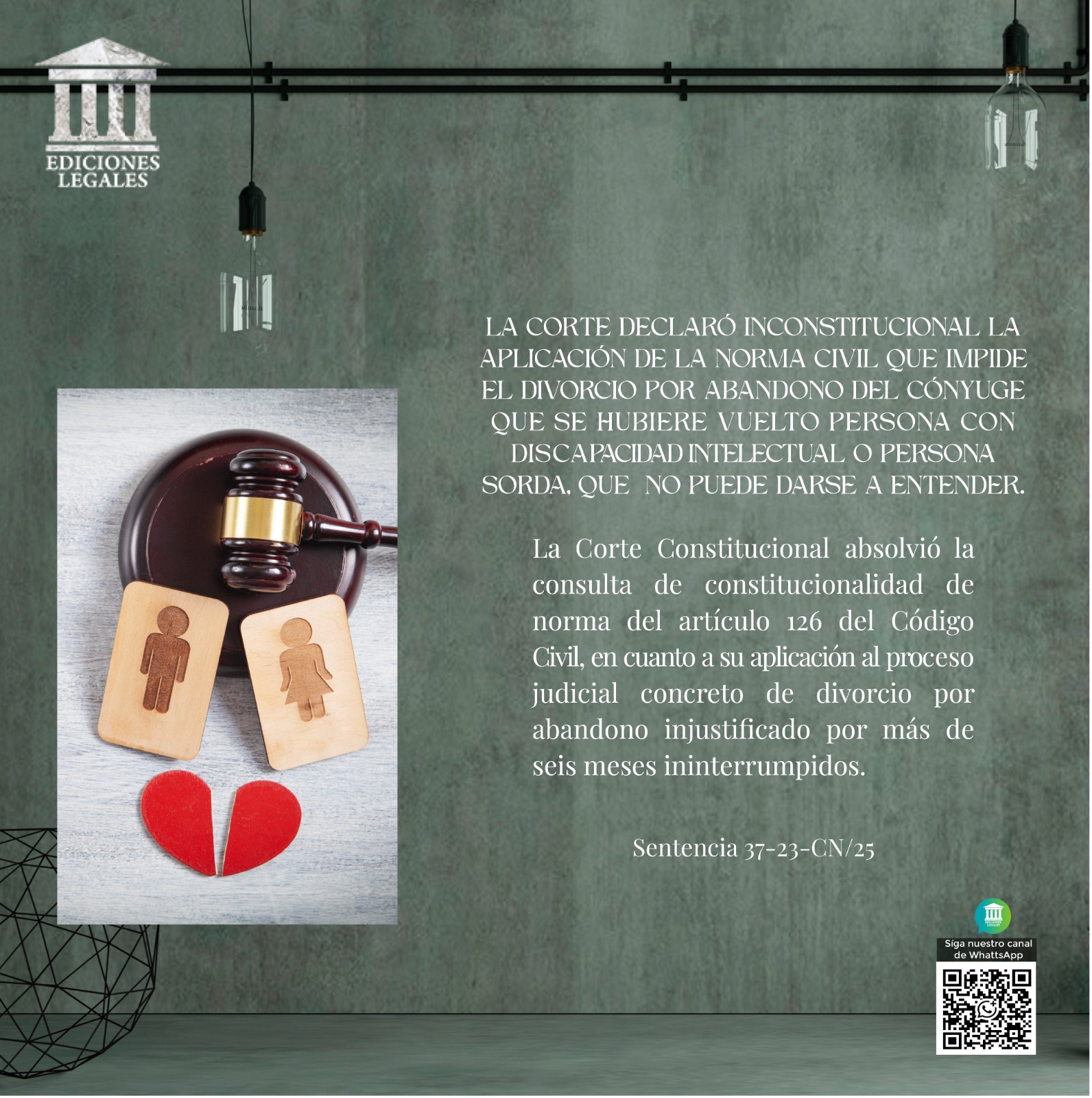La Corte Constitucional absolvió la consulta de constitucionalidad de norma del artículo 126 del Código Civil, en cuanto a su aplicación al proceso judicial concreto de divorcio por abandono injustificado por más de seis meses ininterrumpidos.