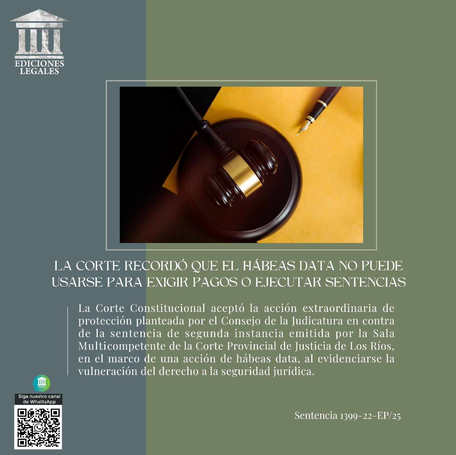 La Corte Constitucional aceptó la acción extraordinaria de protección planteada por el Consejo de la Judicatura en contra de la sentencia de segunda instancia emitida por la Sala Multicompetente de la Corte Provincial de Justicia de Los Ríos, en el marco de una acción de hábeas data, al evidenciarse la vulneración del derecho a la seguridad jurídica.