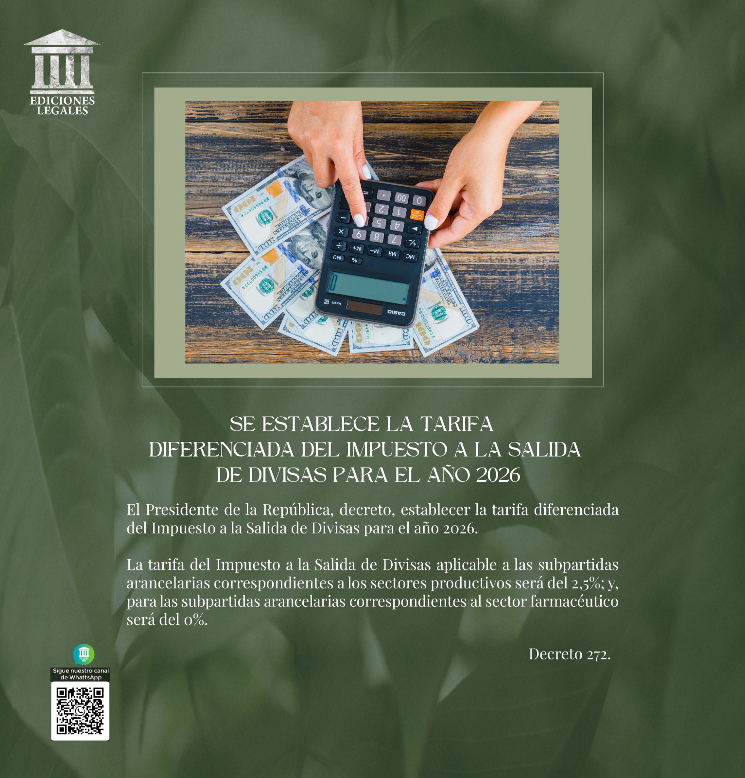 El Presidente de la República, decreto, establecer la tarifa diferenciada del Impuesto a la Salida de Divisas para el año 2026.