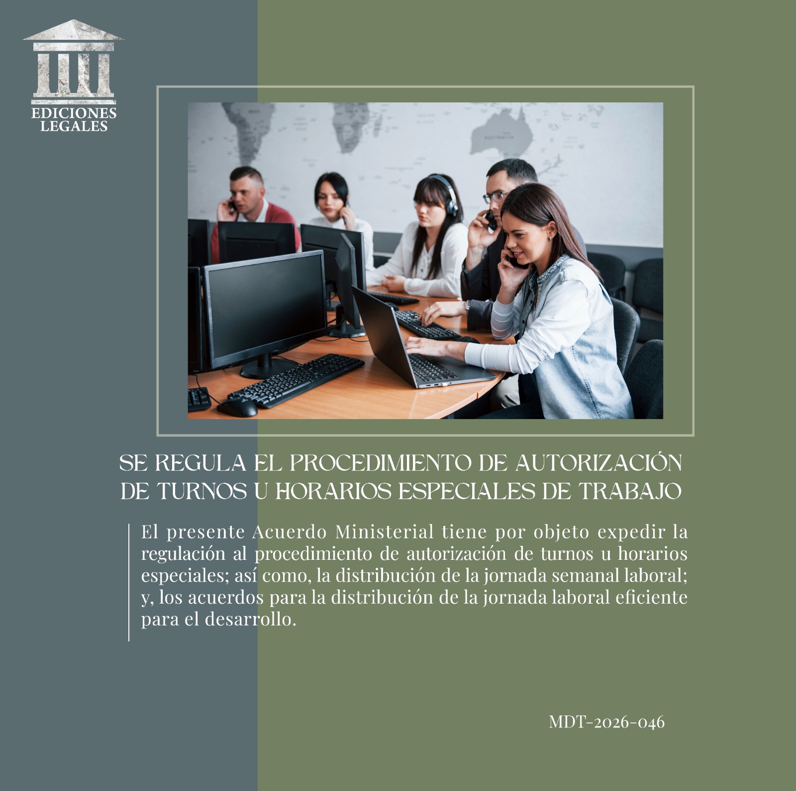 El presente Acuerdo Ministerial tiene por objeto expedir la regulación al procedimiento de autorización de turnos u horarios especiales; así como, la distribución de la jornada semanal laboral; y, los acuerdos para la distribución de la jornada laboral eficiente para el desarrollo.