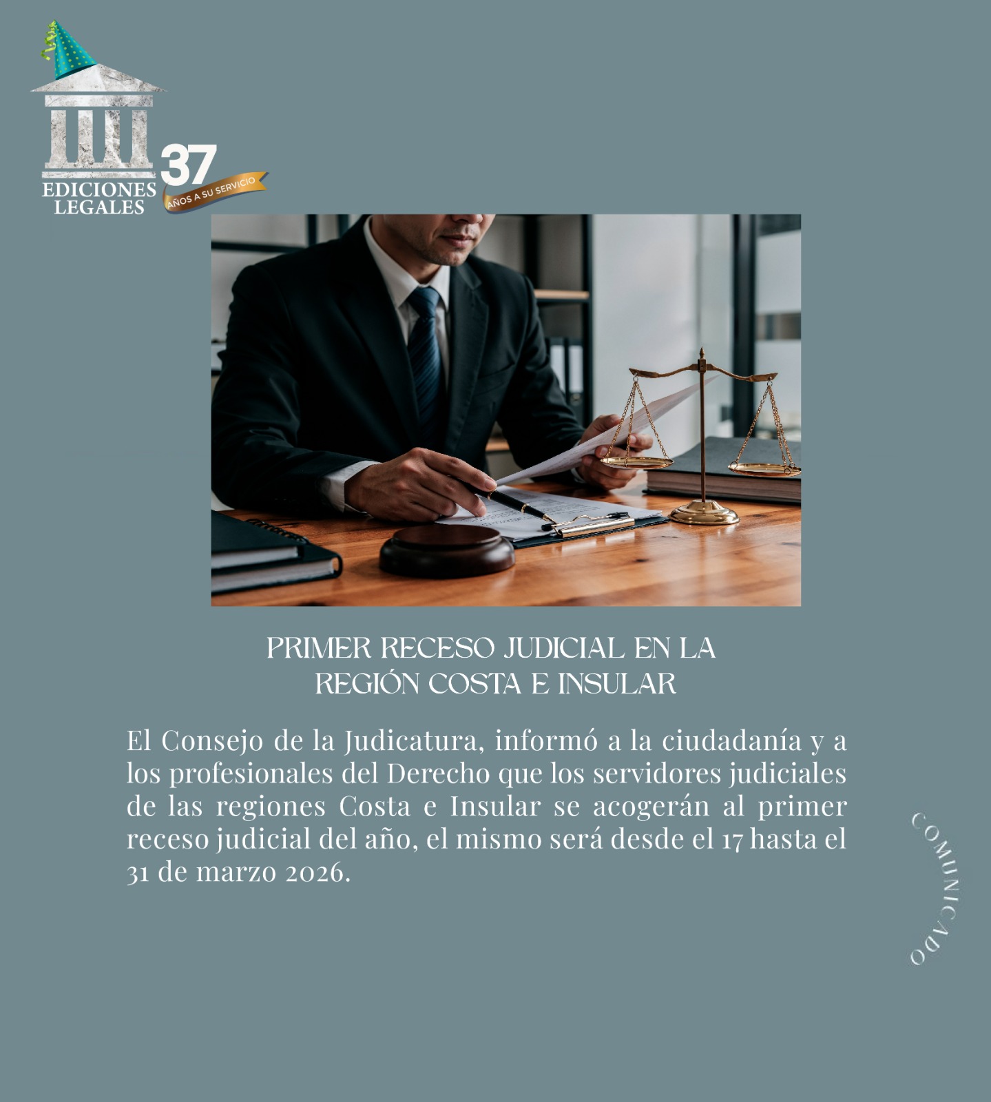 El Consejo de la Judicatura, informó a la ciudadanía y a los profesionales del Derecho que, conforme al artículo 96 de la Ley Orgánica Reformatoria del Código Orgánico de la Función Judicial, los servidores judiciales de las regiones Costa e Insular se acogerán al primer receso judicial del año, el mismo será desde el 17 hasta el 31 de marzo 2026.