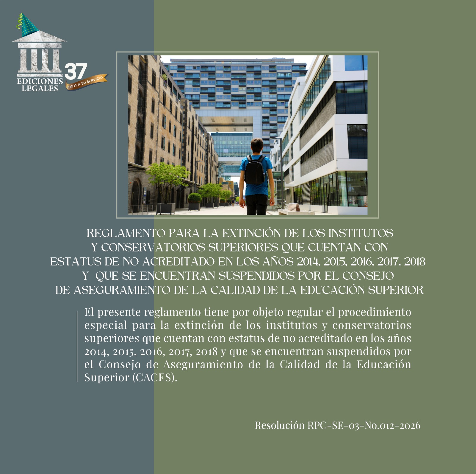 El presente reglamento tiene por objeto regular el procedimiento especial para la extinción de los institutos y conservatorios superiores que cuentan con estatus de no acreditado en los años 2014, 2015, 2016, 2017, 2018 y que se encuentran suspendidos por el Consejo de Aseguramiento de la Calidad de la Educación Superior (CACES).