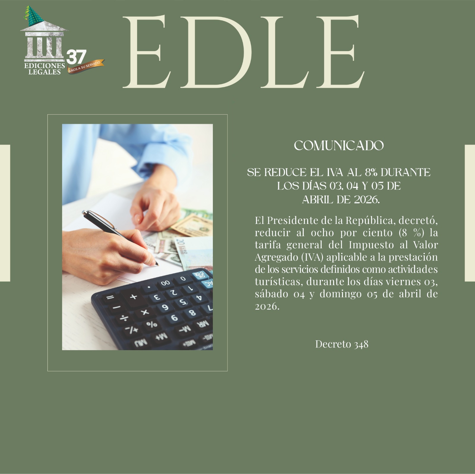 El Presidente de la República, decretó, reducir al ocho por ciento (8 %) la tarifa general del Impuesto al Valor Agregado (IVA) aplicable a la prestación de los servicios definidos como actividades turísticas, durante los días viernes 03, sábado 04 y domingo 05 de abril de 2026.