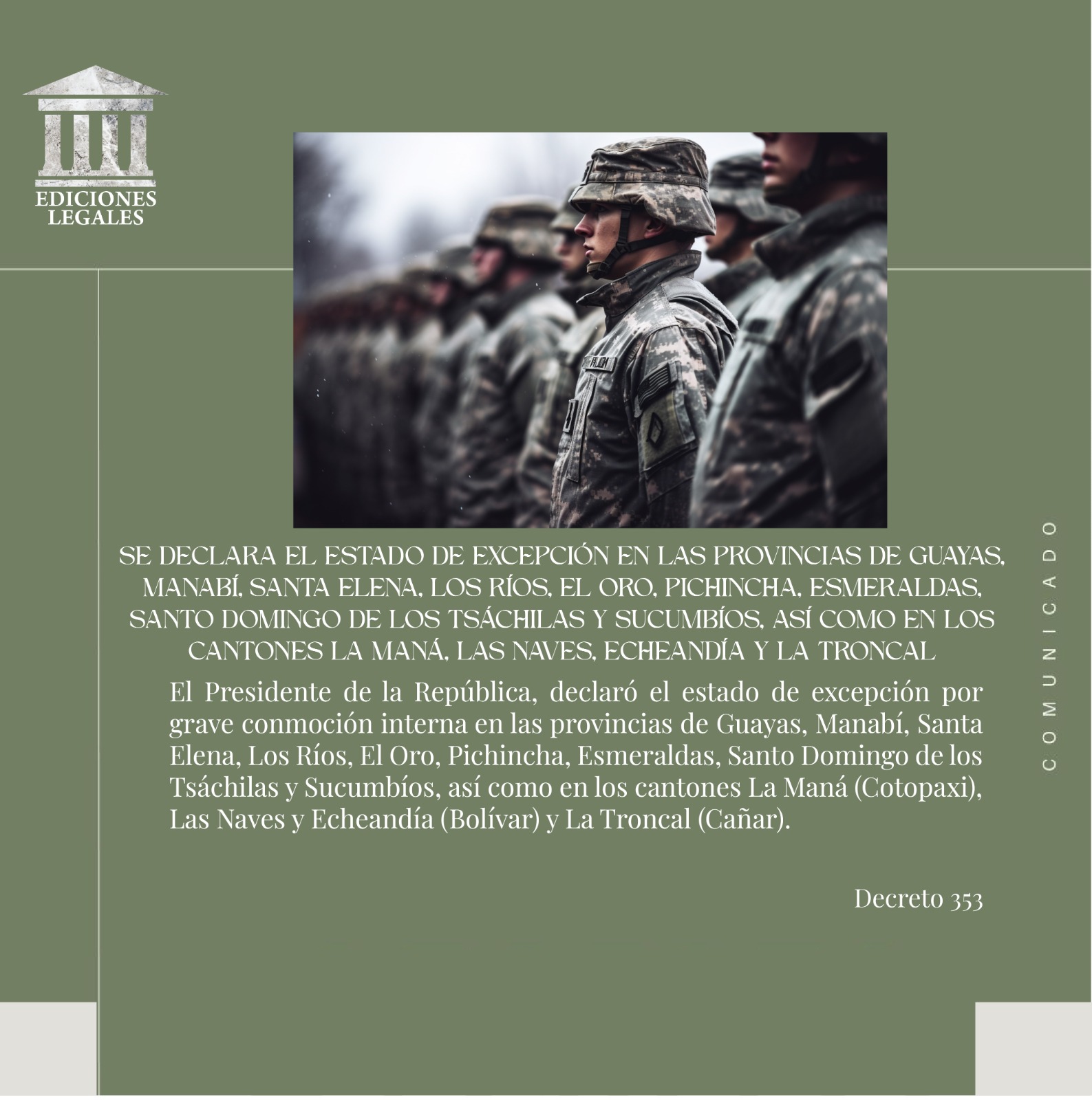 El Presidente de la República, declaró el estado de excepción por grave conmoción interna en las provincias de Guayas, Manabí, Santa Elena, Los Ríos, El Oro, Pichincha, Esmeraldas, Santo Domingo de los Tsáchilas y Sucumbíos, así como en los cantones La Maná (Cotopaxi), Las Naves y Echeandía (Bolívar) y La Troncal (Cañar).