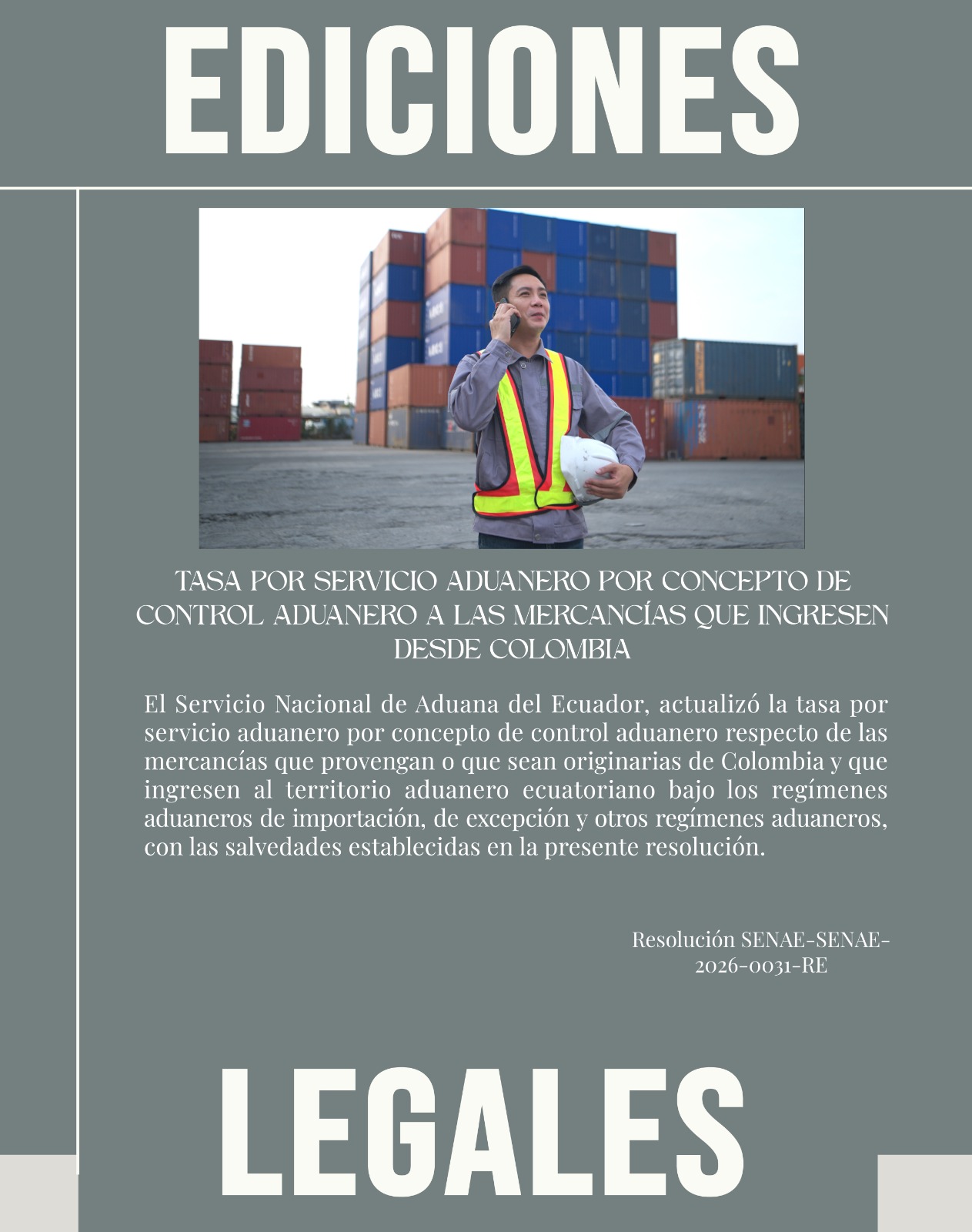 El Servicio Nacional de Aduana del Ecuador, actualizó la tasa por servicio aduanero por concepto de control aduanero respecto de las mercancías que provengan o que sean originarias de Colombia y que ingresen al territorio aduanero ecuatoriano bajo los regímenes aduaneros de importación, de excepción y otros regímenes aduaneros, con las salvedades establecidas en la presente resolución.