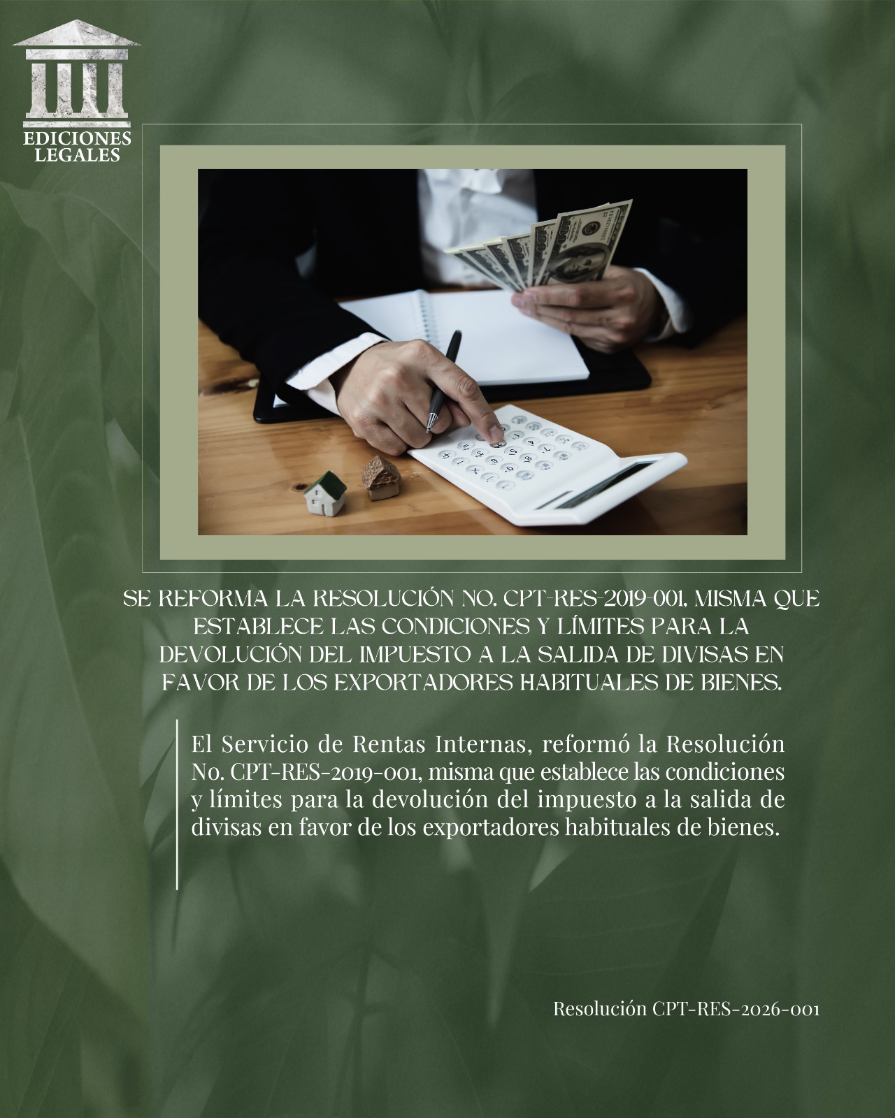 SE REFORMA LA RESOLUCIÓN NO. CPT-RES-2019-001, MISMA QUE ESTABLECE LAS CONDICIONES Y LÍMITES PARA LA DEVOLUCIÓN DEL IMPUESTO A LA SALIDA DE DIVISAS EN FAVOR DE LOS EXPORTADORES HABITUALES DE BIENES.